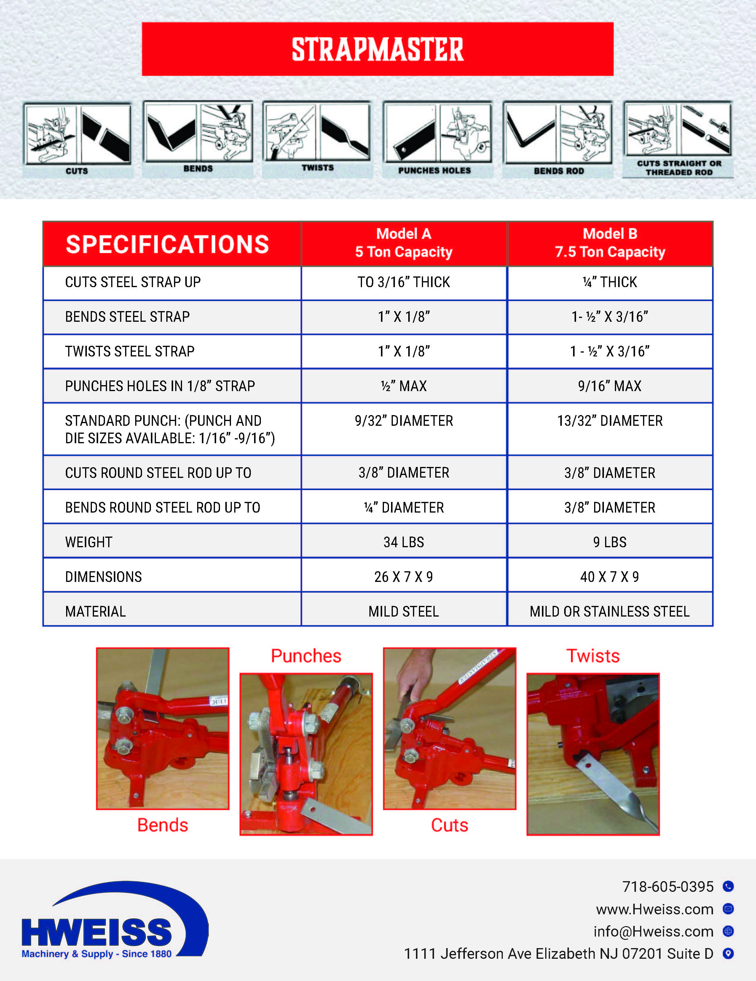 Portable - Manually Operated - One-man Tool shop - Model A StrapMaster, Punches & Dies for HVAC, garage door braces, brackets and hangers. Model A works with mild steel up to 1" wide.